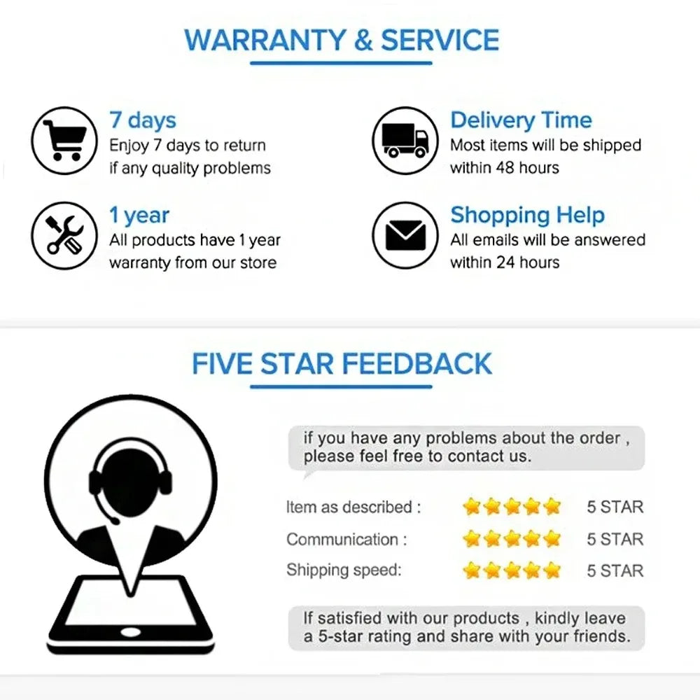 • Garantie "Satisfait ou Remboursé" : Nous sommes convaincus de la qualité de nos produits. Si vous n'êtes pas entièrement satisfait, vous disposez de 14 jours après réception pour nous retourner l'article et obtenir un remboursement complet.Garantie Constructeur : Ce produit bénéficie d'une garantie commerciale de 1 an couvrant tout défaut de fabrication ou panne technique anormale.Procédure Simple : En cas de problème, contactez simplement notre support client. Nous vous guiderons étape par étape pour l'échange ou le remboursement.
